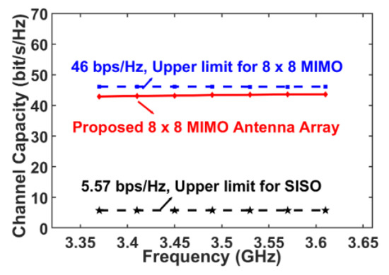 The channel capacity and envelope correlation coefficient are the key criteria for assessing a MIMO antenna diversity and multiplexing capability. Although zero is the ideal value for ECC, in practice the acceptable limit must be less than 0.5 (ECC < 0.5). The value of the ECC can be calculated from the S-parameter or from the far-field radiation pattern [29,30]. This work uses a far-field radiation pattern [31] to calculate the ECC value as expressed in [32,33] (1). From Figure 6f, this work obtained an ECC value lower than 0.01 across the desired band of interest. Figure 9 is the channel capacity plot of the design. The fabricated prototype and measurement set up is shown in Figure 10.