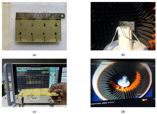(a) Proposed MIMO system fabricated prototype (b) measurement set-up (c) S-parameter measurement by the VNA (d) antenna under measurement in the chamber room.
