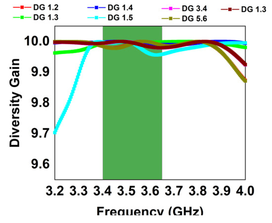 The diversity gain plot of the antenna elements is shown in Figure 11, while Equation (2) is used to calculate the DG from the ECC value. It could be seen that for all the possible combinations, a gain of more than 9.99 dB is achieved over the operation band.