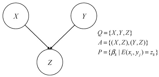 An evidence network is a directed acyclic graph (DAG) that can be formally described as , where denotes an evidence network, denotes a directed acyclic graph with nodes, denotes the set of nodes, denotes the set of connected arcs between nodes, the directed arcs between nodes denote logical relationships between the variables, and denotes the network parameters. An evidence network consists of a network structure and network parameters, and a basic evidence network is shown in Figure 1.