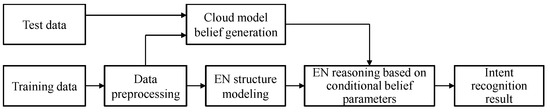 This section will introduce a target intention recognition method based on evidence network reasoning. Based on data preprocessing, measured data obtained by sensors are used to drive the generation of an evidence network structure and root node belief function, and the evidence network reasoning algorithm based on the conditional belief parameters is then used to solve the non-root node belief function and finally achieve target intention recognition. Figure 2 shows the intent recognition process.
