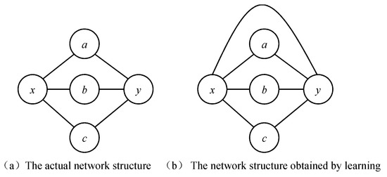 where is a function of sample size, usually set as . The degree of dependence of two nodes can be determined by the size of the MIC. If is large, it indicates that node is directly or indirectly connected to node through one or more nodes; if is small, it indicates that the probability of association between node and node is small. When the MIC value between two nodes is large, it does not mean that the two nodes must be directly connected in the evidence network. When a pair of nodes are indirectly connected through multiple nodes, their MIC value will be larger. Therefore, if only the MIC value is used to determine whether nodes are connected, redundant edges will be introduced. An example of producing redundant edges is shown in Figure 3. Figure 3a shows that node and node are indirectly connected through nodes , and , respectively, resulting in a large MIC value. If nodes are directly connected according to the MIC value, the obtained evidence network structure, as shown in Figure 3b, produces redundant edges and is inconsistent with the actual network.