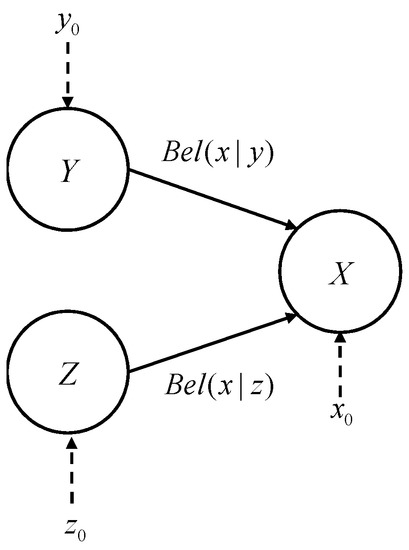 Figure 4 shows the evidence network model with belief reliability as the parameter. The node set of the evidence network is , the directed arc set is , the parameter model is and , and the identification framework of is assumed to be and , respectively. Then, the state information of can be obtained from , and conditional belief and ; that is, can be regarded as the function of , , and :