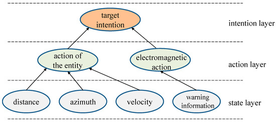 Based on the prior knowledge of experts in combination with the MIC algorithm, the correlation between nodes is judged. The evidence network structure modeling is carried out for the target intention recognition, and the dependency and ownership relationship between nodes are obtained. As shown in Figure 5, the target intention can be expressed in a hierarchical way, which is divided into the state layer, action layer, and intention layer. The perceived state describes the state data of the target, indicating the change in the target’s action, including the distance, speed, and other information. Action reasoning describes the action taken by the target and the role it plays, including entity action and electromagnetic action, among which entity action is associated with distance and speed information and electromagnetic action is associated with alarm information. Intentional reasoning describes the inference or estimation of an entity’s intention.
