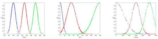 Target identification needs to rely on multiple attributes, such as speed and height. For the attribute of target speed, membership functions corresponding to high speed, medium speed, and low speed are expressed as , , and , respectively. Different membership functions may intersect, which corresponds to the combination state of categories. If the membership function represents the attribute model that may belong to category or category , its mathematical expression can be described as: