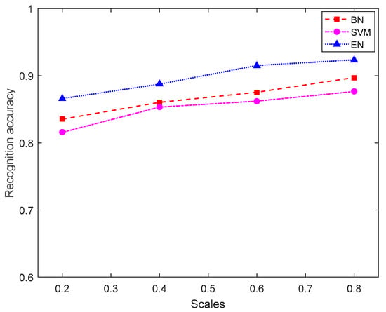 Comparison of the recognition accuracy of EN, BN, and SVM models with different data scales.