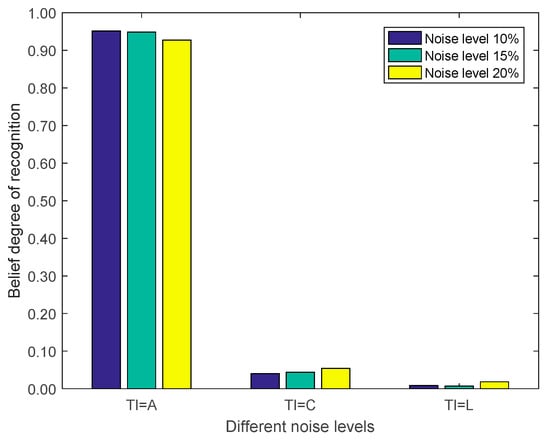 In order to verify the effectiveness of the algorithm proposed in this paper, noise is added to the feature data of the target, and the noise level is varied according to 10%, 15% and 20% to obtain the belief results of the target intention recognition; the consistency with the known results is compared. Figure 8 shows the recognition belief levels of target intention A, C, and L under three different noise levels. It can be seen that although the noise levels greatly vary, the belief levels corresponding to each element in the framework of target intention identification remain relatively stable, which proves that the proposed intention recognition method is insensitive to noise changes and has good stability and reliability. The proposed method can correctly identify the target intention.