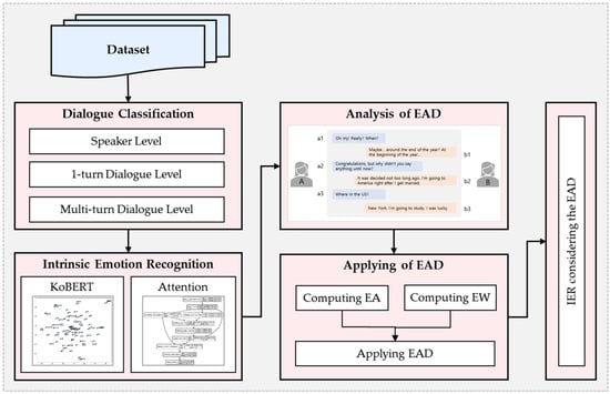 This section describes the IER process considering the proposed EAD. Figure 1 shows the configuration diagram of the proposed method. IER considering EAD includes the dialogue classification stage, IER stage, IER in Dialogue stage, and EAD application stage. In the dialog classification step, dialogue data between two speakers are classified into SL, 1-turn DL, and multi-turn DL dialogues based on the speaker according to the characteristics of the dialogue. In the IER stage, multi-emotion sentences are recognized. In the IER in the Dialogue step, multi-emotion sentences are recognized by applying the IER to the dialogue. In the EAD application stage, the EAD is derived through the analysis of emotional association between sentences and dialogues, and IER is implemented by applying it.