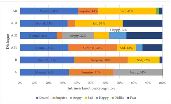 In this section, multi-emotion sentences are predicted by applying IER to the three types of SL, 1-turn DL, and multi-turn DL dialogues classified above [22]. Table 2 shows the emotions and IER results classified in the data set for each sentence, and Table 3 shows the results of applying IER to Dialogue. Figure 2 shows the emotion ratio by dialogue as a result of IER. Using IER, multi-emotion can be recognized by inputting a data set classified as a single emotion per sentence, and multi-emotion sentences can be recognized by inputting dialogues classified into three categories, as shown in Table 3. From Figure 2, we can see how many emotions are intrinsic in the dialogue.