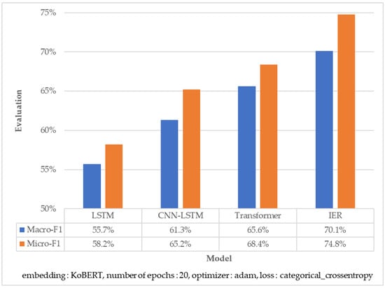 To verify the proposed IER, we compare and evaluate using the multi-class evaluation methods Macro-Fl and Micro-F1. Figure 3 is a graph comparing Macro-Fl and Micro-F1, which are multi-classification results of LSTM, CNN-LSTM, and Transformer models and the proposed IER. As a result of comparing the multi-classification performance of each model, it can be seen that the proposed IER Macro-F1 and Micro-F1 perform the best. It can be seen that the performance of the proposed method is improved by 16.6% and 9.6% compared to the LSTM and CNN-LSTM models, and the performance of the proposed method is improved by 6.4% compared to the Transformer model. The reason for the best performance of the proposed method is considered to be that the attention model is effective in analyzing the correlation in dialogue because it better grasps the dependence between words. If you collect more training data and improve the model, you can improve performance.