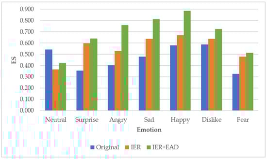 Next, we compare the similarity between emotions and sentences to verify the IER applying EAD. We also compared the original data (Original) and IER, and IER+EAD where EAD is applied to IER using emotion and sentence similarity. The similarity is determined as the sum of the similarities between emotions and words in a sentence, and cosine similarity, which is often used to compare emotions, is used. The cosine similarity refers to a similarity obtained by using a cosine angle between two vectors. Figure 4 shows a comparison graph of emotional similarity (ES) of sentences. As a result of comparing sentence similarity between emotion and Original, IER, and IER+EAD, it can be seen that the proposed IER+EAD has the highest similarity, and it can be confirmed that IER has a higher similarity than Original. This means that IER recognizes more diverse and detailed emotions than Original, and IER to which the proposed EAD is applied recognizes the most accurate emotions of dialogue.