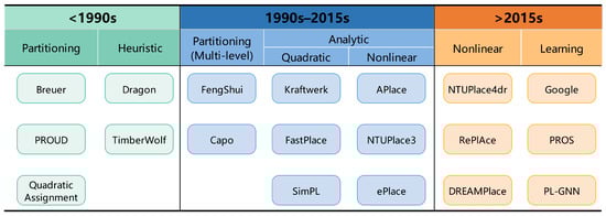 Description of placement algorithms and the corresponding placers in academia. As the design size increased, the dominant placement algorithms shifted from the early partitioning-based method to heuristic algorithms. Later, the partitioning method began prevailing again due to the application of the multi-level framework. In some recent academic contests, such as ISPD [3,4,5,6,7], DAC [8], and ICCAD [9,10,11], the analytical methods provided better results than the previous algorithms. Nowadays, the leading placers mainly use nonlinear rather than quadratic methods because of the higher quality obtained with nonlinear methods. Furthermore, learning-based algorithms are gaining more and more attention, and a well-known example is Google’s automatic macro placer [12].