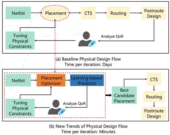 Automatic design solves smaller-scale placement problems, especially macro placement. Based on the graph convolutional network (GCN) and RL, Google’s method [12,51,83] trains an agent to automatically place macros and then place the standard cells using the force-directed method. When all the cells are placed, the reward can be computed and the RL policy is updated. They claim their approach can leverage experience to learn rich and transferable representations, making it applicable to placement optimization for unseen netlists. Their experimental results show that their well-trained agent can generate manufacturable chip floorplans in under six hours, which requires months of effort by human experts. The code is publicly available at: https://github.com/googleresearch/circuit_training (4 January 2023). However, their work cannot be done without the support of enormous computing power. Based on Google’s work, DeepPlace and DeepPR were developed in [84] to optimize macro placement and to route with two RL agents jointly. Jiang et al. [85] replaced the force-directed method used by Google [12,51,83] with DREAMPlace [88] to place soft macros, which can quickly yield better placement results. Lai et al. [86] observed that the hypergraph constructed by previous work [12,51,83,84,85] is not scalable to comprehensively encode information of a netlist. They developed a novel RL method, named MaskPlace, which casts placement as a problem of pixel-level visual representation learning for circuit modules using convolutional neural networks (CNN). Experiments on public benchmarks show that MaskPlace outperforms existing RL approaches [12,51,83,84,85] in all key metrics, including wirelengh, congestion, and density. Another work [87] explored new heuristic algorithms for macro placement using RL. Specifically, a deep Q-Network agent was trained to walk through the search space by selecting a candidate neighbor solution at each step, where perturbing sequence pairs generate the neighbor solution.