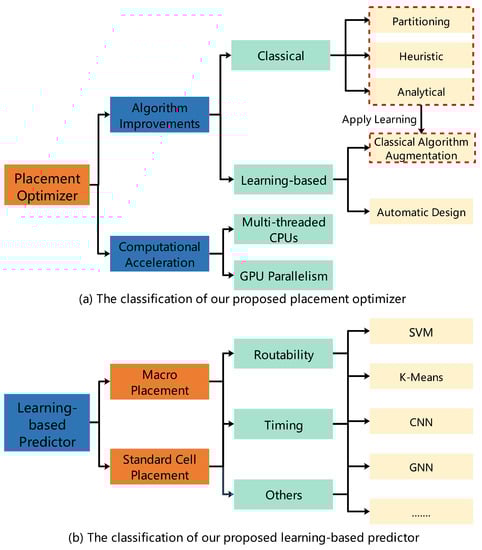 We divide the improvement directions of placement algorithms into classical and learning-based, as shown in Figure 3. The significant difference between them is whether they can learn, i.e., optimize a new problem using prior knowledge or experience. Classical algorithms do not have an explicit training or testing process, and they must solve a new issue from scratch each time. Learning-based algorithms, in contrast, introduce ML/DL to complete a placement. Learning algorithms are expected to reduce the design cycle further [12,51]. Due to their learning capability, only the trained models need to be finetuned and can be applied to solve a new problem.