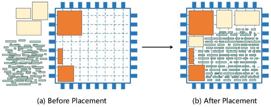 Placement is a multi-objective optimization problem that requires a rational determination of the locations of macros or standard cells. The problem can be described as follows [15]: Given the placement region P, the input netlist (V denotes the macros or standard cells to be placed; E denotes the connections between circuit cells), and the objective function , find the location of each such that (1) the objective function is minimized and (2) the design constraints are satisfied. The objectives are usually one or more of these: wirelength [3], routability [8], timing [10], power [16], thermal [17], and manufacturability [18]. The design constraints typically include cells not overlapping, cells being placed within the placement region, placement density being less than a threshold, fence region constraints [7], and so on. The visualization of the placement process is given in Figure 4.