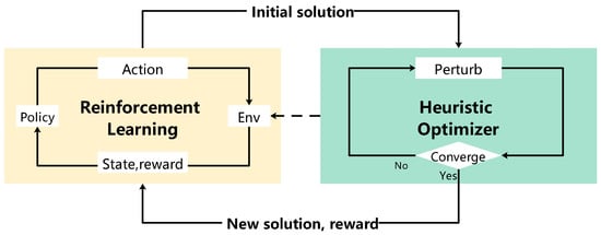 The reinforcement learning (RL)-driven heuristic optimization framework. This framework consists of the RL agent and the heuristic optimizer. The RL agent generates the initial solution for the heuristic optimizer. Then, the heuristic optimizer completes the execution until convergence conditions are met and returns a new solution and reward to the RL agent for retraining.