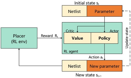 Classical placement algorithms take much time to adjust the parameters to get a satisfactory solution. Automatic parameter tuning by ML can improve placement efficiency. A RL framework for optimizing the placement parameters of commercial EDA tools is presented in [76,77]. The framework is shown in Figure 6. The state contains the netlist information and the current parameter set. The agent uses the actor–critic framework to get a new parameter set. The reward is the negative value of the HPWL output from the commercial EDA placement tool. The method uses a GNN to generate node embeddings, allowing the framework to generalize well to unseen netlists. Their experimental results under the TSMC 28nm technology node included up to 11% and 2.5% wirelength improvements on unseen netlists compared with a human engineer and a state-of-the-art tool auto-tuner, in just one placement iteration (20× and 50× less iterations). This work demonstrates the potential to accelerate VLSI PD through automatic parameter tuning. In addition, there are other efforts [78,79,80,81,82] for automatic-design-flow parameter tuning.
