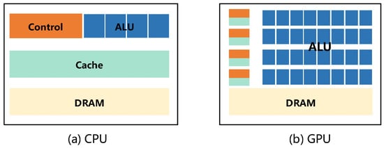 Comparison of CPU and GPU architectures. The orange, blue, green, and milk-white rectangles represent the control unit, computing unit, cache, and memory.
