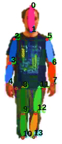 Location of 14 points in the human body that are recorded during exercise: 0. Head; 1. Chin; 2. Right shoulder joint; 3. Right arm elbow joint; 4. Wrist joint of right hand; 5. Left shoulder joint; 6. Left arm elbow joint; 7. Left wrist joint; 8. Right side hip joint; 9. Knee joint of the right leg; 10. Ankle joint of right leg; 11. Left side hip joint; 12. Left leg knee joint; and 13. Left ankle joint.