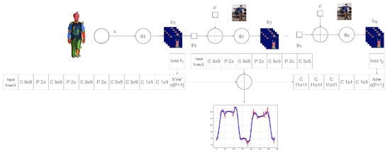 The motion recognition model is based on Convolutional Pose Machines (CPM), which are based on deep neural networks. Neural networks are trained to detect keypoints in the human body, namely the joints, scalp, and chin. Figure 2 shows the architecture of a motion recognition system based on deep neural networks. The system architecture uses 16 convolutional layers (indicated by the letter “C” in Figure 2) and 6 pull-out layers (indicated by the letter “P” in Figure 2). Localisation of key points is performed using regions of different sizes in different convolutional layers. Seven differently sized regions are used to process an image with sizes of pixels, , , , , , , and , respectively. The use of regions of different sizes ensures an accurate search for keypoints. The model processes the images received in real time from the video camera and outputs the changes in the x and y coordinates of the keypoints recorded over time.