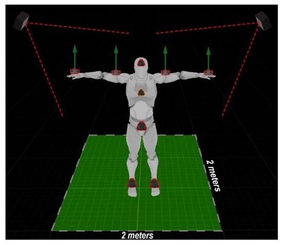 This section introduces the configuration of the human exercise tracking system that was used to record exercises. The developed exercise tracking system uses the HTC Vive system and at least eight second-generation HTC Vive sensors. These sensors allow you to track the position in space and angles of rotation. The system requires at least two HTC Vive units (called base stations), but it is recommended to use four stations for easier use and more-accurate tracking. The layout of the sensors is shown in Figure 4.