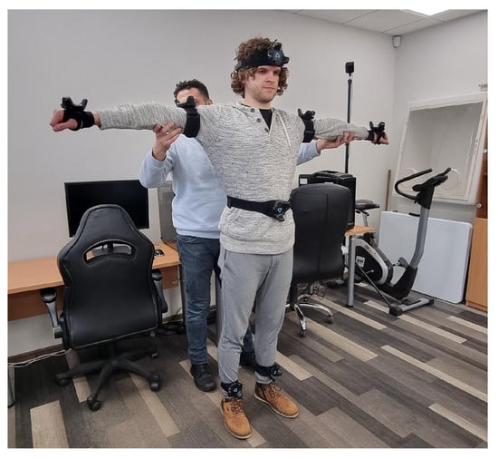 The subject is first asked to stand in the so-called ‘T’ position (standing upright with arms outstretched) then extend both hands forward after waiting 10 s. Naturally, standing in the “T” posture for 10 s might be challenging for post-stroke patients due to hemiparesis or loss of muscle tone, strength, or coordination. In this instance, the aid of a nurse or home caregiver is required to hold both affected arms in the correct position during system calibration (Figure 6). Because the assistant (e.g., a nurse or home caregiver) is not wearing sensors, she is not detected by our system and has no bearing on the skeleton reference registration even if her hands cover the actual sensors on some body part(s) of the patient. The calibration of VR sensors aims to link VR trackers with a human and a virtual avatar. During calibration, we indicate which sensor is attached to a certain part of the body, and after a couple of movements, the person is associated with his virtual avatar (Figure 7). The calibration data are then recorded and the exercise can be performed.