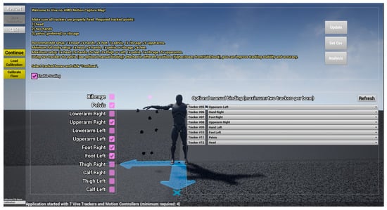 The developed software system, named BiomacVR, for recording patient movements is described in this section. The system was developed using the Unreal Engine (Epic Games, Cary, NC, USA). The VR sensors required to record patient movement use HTC Vive VR equipment (HTC Corporation, New Taipei, Taiwan). The system requires a Microsoft Windows operating system (Microsoft Corporation, Redmond, WA, USA) and Steam software package (Valve Corporation, Bellevue, WA, USA). The programme uses the Steam VR subsystem to configure the VR environment used for sensor tracking.