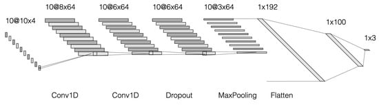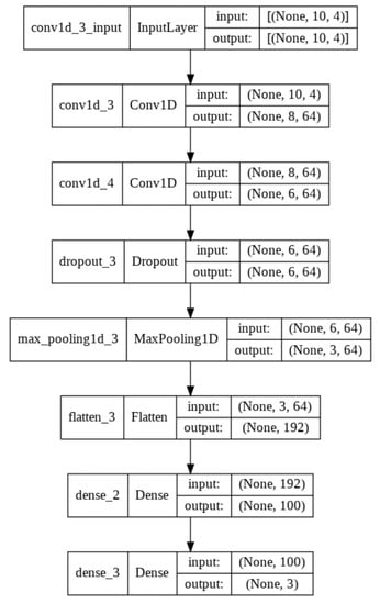 In addition to the CNN network structure (layers), it is still necessary to define the parameters required for training, such as the number of epochs, the sample size, and the number of sample data required for validation. As with the RF model, a random search grid is created to automatically generate a CNN model for each movement under study. After 100 iterations, the model is selected that most accurately classifies the data. The following hyperparameters of the CNN model are considered: