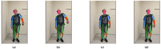 Many human position estimation methods collect skeletons or skeleton points from depth sensors these days [29,30]. However, for rehabilitation purposes, identification of motions (including directions and angles) and joint centres is required. Although various posture estimation methods and exergames have been created and presented, most existing systems focus on extracting skeletons or skeleton points from a depth sensor and primarily focus on human pose estimate rather than joint movement determination (including directions and angles) [31]. For example, Lee et al. [32], for the evaluation of upper extremity motor function in stroke patients, proposed a sensor-based system with a depth sensor (Kinect V2) and an algorithm to classify the continuous Fugl–Meyer (FM) scale based on fuzzy inference. The values obtained from the FM scale had a strong correlation with the scores evaluated by the clinician, indicating the prospect of a more sensitive evaluation of motor function in the upper extremities. Ayed et al. [33] suggested a method to assess the Functional Reach Test (FRT) using Kinect v2; FRT is one of the most widely used balancing clinical instruments for predicting falls. These findings indicated that the Kinect v2 unit is capable of calculating the conventional FRT. Using a bidirectional long- and short-term memory neural network (BLSTM-NN), Saini et al. [34] propose a Kinect sensor-based interaction monitoring system between two people. This methodology is used to help people get back on their feet by assessing their actions. Capecci et al. [35] present a data set of rehabilitation activities for low back pain (LBP) acquired by an RGB-D sensor. The RGB, depth videos, and joint locations of the skeleton are included in the data set. These characteristics are utilised to calculate a score for the subject’s performance, which may be used in rehabilitation to measure human mobility. Wang et al. [36] presented an experimental platform of a virtual rehabilitation training system to analyse upper limb rehabilitation exercises for subjects with stroke caused by hemiplegic dyskinesia. Hand motion tracking is realised by the Kinect’s bone tracking based on the Kinect depth image and colour space model. Sarsfield et al. [37] conduct a clinical qualitative and quantitative analysis of the pose estimation algorithms of the Xbox One Kinect in order to determine their suitability for technology-assisted rehabilitation and to help develop pose recognition methods for rehabilitation scenarios. In the upper-body stroke rehabilitation scenario, the researchers discovered difficulty with occluded depth data for shoulder, elbow, and wrist joint tracking. They determined that in order to infer joint locations with complete or partial occlusion, pose estimation algorithms should consider leveraging temporal information and extrapolating from prior frames. This should also decrease the potential of mistakenly inferring joint position by excluding quick and dramatic changes in position.