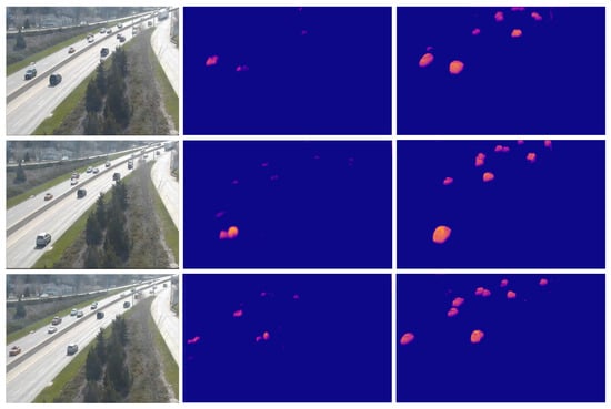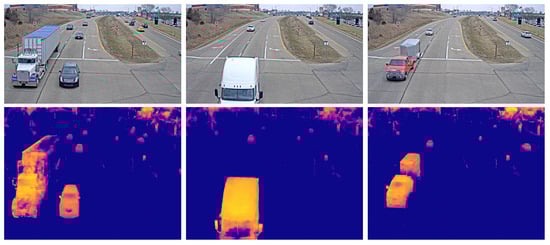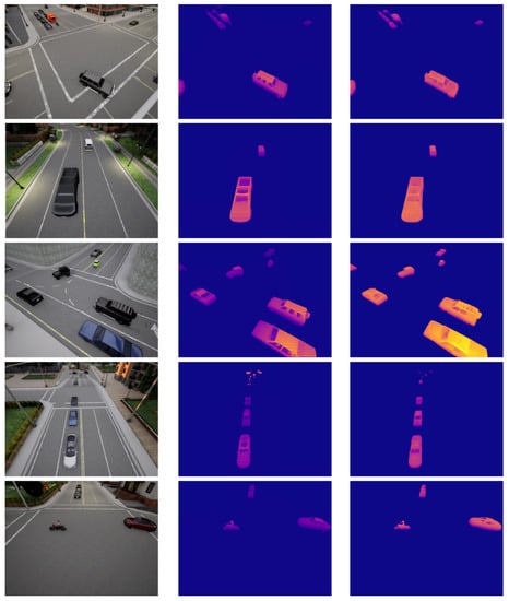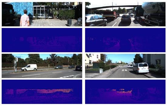 Figure 5 shows the results of learning by converting KITTI’s Depth Dataset [29] as if it had generated a CARLA dataset. The KITTI Depth Dataset was collected through sensors attached to cars. As this is not a fixed-camera environment, the environment continues to change in real time. In addition, it is characteristically difficult to secure a dense pixel data value because the data in this dataset were collected using a sensor. This characteristic is illustrated in Figure 6. The results obtained using the KITTI dataset are very unstable compared with the results generated by the CARLA simulator. This is because of the nature of the dataset. For more accurate results, fixed environmental datasets such as CCTV are more advantageous.