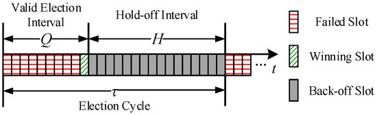 We start the analysis of the neighbor election by considering a typical node i. From the perspective of node i, the slots are partitioned into two types of intervals: the valid election interval and the hold-off interval. Node i first participates in the elections within its valid election interval of V slots and competes with its neighbors. After winning the chance of transmitting in a slot of index , it suspends the participation in elections and steps into a hold-off interval of H slots. When the hold-off interval ends, node i will enter the next valid election interval and rejoin the election. The duration between the start of two consecutive valid election intervals is termed as an election cycle [9] of slots, which is illustrated in Figure 1.