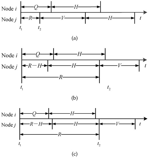 We concentrate on the election process of typical node i and a timely maintained neighbor node j within two-hop distance. These two nodes will not win the same election and thus have different transmitting slots. To analyze the competing probability of j, we suppose that node i and j enter their new election cycles at slot and respectively. Let denote the residual slot number of the previous election cycle of j when i has entered its new one. Node i will consider j as a competing node during the intersections of their valid election intervals, which can be divided into three cases as illustrated in Figure 2. Let denote the duration ratio of an intersection to node i’s related valid election interval. From the perspective of i, the competing probability of j can be written as the expectation of :