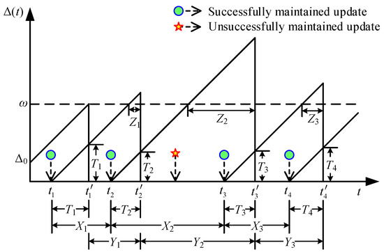 An illustration of the AoI process of node j observed at node i is presented in Figure 3, where denotes the consumed time of k-th successful maintenance, denotes the interval between two consecutive and successfully maintained updates, denotes the duration of k-th maintenance interval. Let denote the age threshold that a neighbor cannot be timely updated as referred to in Section 2, and let denote the violation duration that AoI exceeds the threshold in k-th maintenance interval.