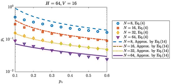 To verify the accuracy of our approximations, we first take the age violation probability as an independent variable to analyze its impact on the transmission probability . We substitute Equation (18) into Equation (1) and obtain the approximated value of as the positive root of a quadratic equation, which is given as follow: