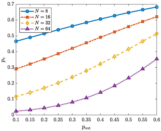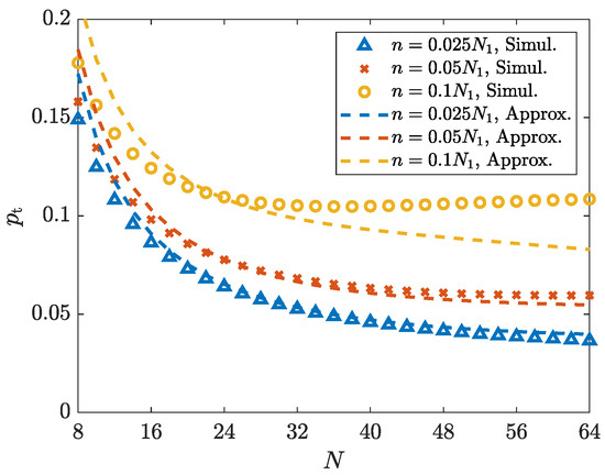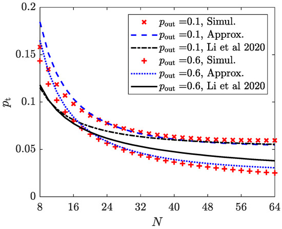 To obtain the approximation results, we search the value of which can satisfy both Equations (27) and (28) simultaneously under different parameters including the number of neighbors N, the ratio of relaying nodes and the packet loss rate .