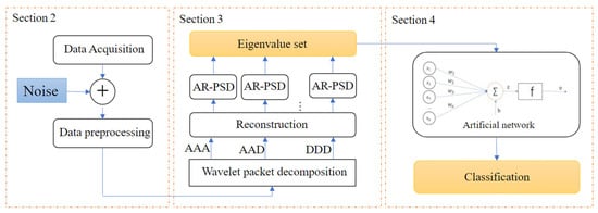The rest of this paper is organized as the below block diagram in Figure 1. Section 2 introduces the vibration signal acquisition, including the diesel engine, dynamometer, and acceleration signal acquisition equipment. Section 3 describes the wavelet packet decomposition and eigenvalue extraction of the vibration signals. Section 4 introduces the establishment and training of the artificial neural network, and reports the experimental results. Finally, Section 5 summarizes this paper and draws the advantages compared with other methods.