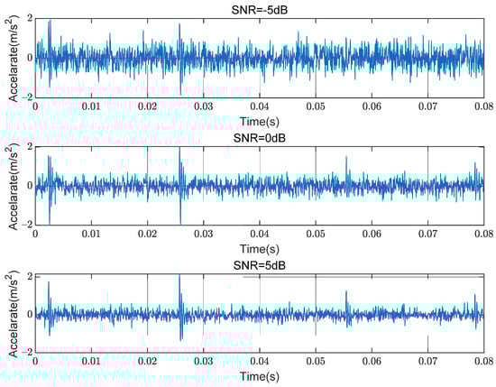 Use Formula (1) to calculate 11 kinds of noisy signals with a signal-to-noise ratio (SNR) ranging from −5 dB to 5 dB, respectively. Each group of noise is generated independently, so each noise superimposed on the signal is different. Figure 4 shows the time-domain waveform of the signal with SNR equal to −5 dB, 0 dB, and 5 dB, respectively, of the H state.