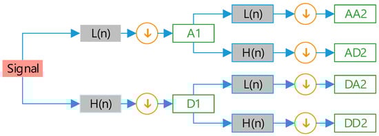 In [,], the definition of discrete wavelet packet transform (DWPT) is introduced. DWPT is an expansion and optimization of discrete wavelet transform (DWT). Unlike DWT, at each level of the decomposition process of signals, not only is the low-frequency sub-band further decomposed, but the high-frequency sub-band is further decomposed as well. DWPT calculates the optimal signal decomposition path via minimizing a cost function, which decomposes the signal transmitted in the input channel. Figure 5 shows two-layer wavelet packet decomposition.