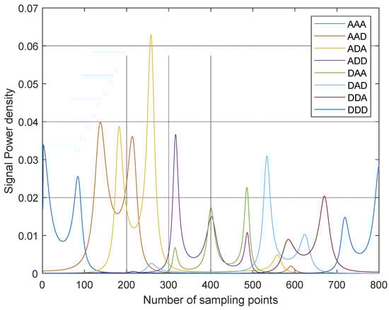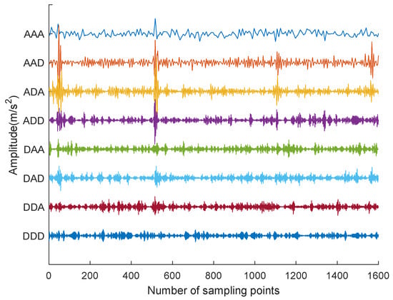Via employing db3 as the wavelet basis function and Shannon entropy as the cost function, the three-layer discrete wavelet packet decomposition was carried out on experimental data with 1600 points in each group, and eight groups of wavelet packet coefficients were obtained. Signal reconstruction was carried out on each group of coefficients to obtain the time-domain signals of eight frequency sub-bands, as shown in Figure 6.