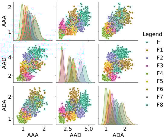 Table 3 shows the eigenvalues of a group of experimental data for each of the nine valve clearance states. The eigenvalues of all 9 × 50 groups of experimental data were analyzed, and Figure 8 shows the correlation (off-diagonal) and distribution (diagonal) of the eigenvalues [].