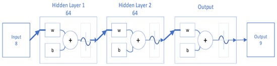 The features of a single neuron are few, but it can be enhanced by stacking multiple neurons in parallel to realize a multi-input and multi-output (MIMO) network layer. A three-layer neural network was created to classify the eigenvalues of the vibration signals extracted in the previous section. As there were eight kinds of input eigenvalues, the number of nodes in the network input layer was eight. Layer one and layer two were hidden layers, with 64 nodes each. The output layer corresponds to nine fault states, which are discrete eigenvalues and adopt one-hot coding, so there were nine nodes. Figure 10 shows the network structure, with 5321 parameters to be trained.