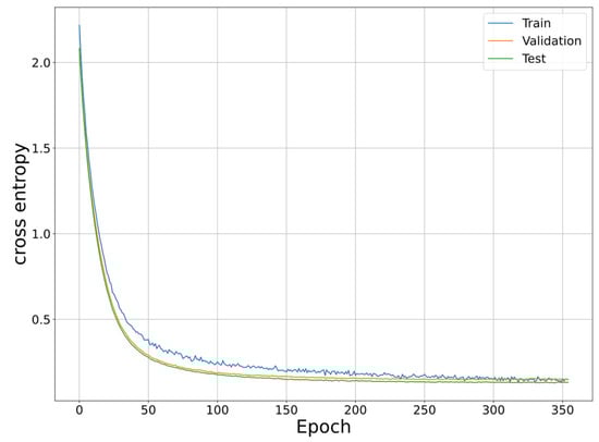 Figure 11 shows the change curve of the loss function (cross entropy) of the training set, validation set, and test set to the epoch, when the input was a data set with SNR = 0 dB. Figure 12 shows the change curve of mean squared error (MSE). Figure 13 shows the change curve of the classification accuracy to the epoch. When the training was completed, the accuracy of the test set was 91.8%.