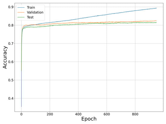 A dropout layer with a dropout probability of 0.5 was inserted in front of the second hidden layer, the mixed data set was trained, and an accuracy curve was obtained as shown in Figure 15. When the training was completed, an accuracy of 82.4% was achieved for the test set.