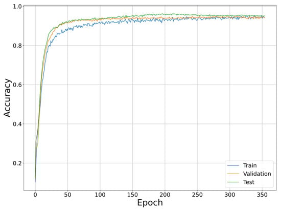 To let the artificial neural network classify the experimental data of various SNRs, it was necessary to carry out mixed training on the experimental data of all SNRs. The scale of the mixed data set was 11 times that of the independent training, and the distribution became complex. In this scenario, the training algorithm will obtain unnecessary information from the noise and express it in the model parameters, resulting in the overfitting phenomenon. As shown in Figure 14, the accuracy of the training set in the figure also increased with the magnification of the training epoch, while the accuracy of the verification set and the test set hardly increased, which indicates an overfitting phenomenon.