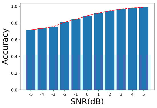 Eleven types of experimental data sets were trained with SNRs = −5 dB, −4 dB, …, 5 dB, respectively, and the test accuracy at the end of the training was recorded as being 0.769, 0.807, 0.829, 0.873, 0.893, 0.918, 0.951, 0.973, 0.978, 0.980, and 0.982, respectively. The formula for the accuracy was as follows: