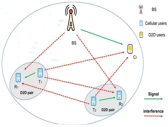 D2D communication technology refers to enabling two terminal devices with close geographical locations to bypass the base station (BS) directly for short-distance communication [15]. In a broad sense, any link that can communicate directly in authorized or unauthorized frequency bands can be regarded as D2D communication [16]. Due to the inherent requirements for high-speed data transmission, low-delay communication and specific areas’ or users’ communication quality, D2D communication technology is considered the key technology in 5G cellular networks and an important part of future communication [17]. D2D communication can also save energy. In short-distance communications, the transmission power of D2D is very small, which greatly saves electric energy. In terms of the use of spectrum resources, D2D communication has a variety of communication modes. In the D2D communication mode, only one communication link is required for information transmission; two communication links are required in cellular mode. Most importantly, cellular users and D2D users can share the same radio spectrum resource.