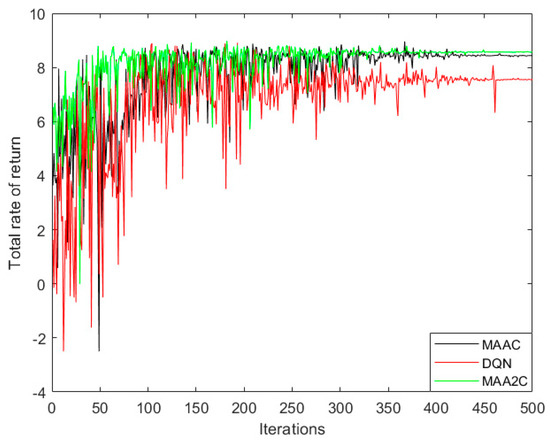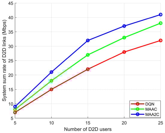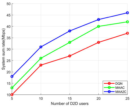 In order to prove that the proposed algorithm has good performance for D2D user throughput in cellular networks, Figure 8 shows the change curve of the number of D2D link systems and D2D communication pairs. The total throughput of the D2D link system is represented by the ordinate (after the throughput of all D2D users). The abscissa represents the change in the number of D2D users. It can be seen from the figure that the MAA2C algorithm performs best among the three algorithms. It can be seen from the figure that when the number of D2D users is two to three times the number of cellular users, the optimization effect gradient is MAA2 > MAAC > DQN. This is because the reward function in the MAA2C algorithm is based on the real-time throughput of D2D users in the D2D link, and the throughput growth of D2D users is taken as the positive feedback of the system. The effect of all outputs is optimal. In the later period, as the number of D2Ds continues to increase, the algorithm proposed in this paper grows slowly. This also proves that the proposed algorithm has good convergence ability and dynamic adaptive resource allocation ability.