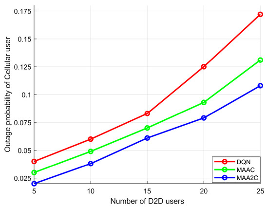 In order to prove that the proposed algorithm has good performance in protecting the communication quality of cellular users, this paper presents the curve trend chart of cellular user outage probability. Figure 6 shows the relationship between the outage probability of cellular users and the number of D2D links. It can be seen from the figure that with the increase in D2D logarithm, the distributed MAA2C algorithm proposed in this paper is superior to the other two algorithms. First, the three methods all use the distributed interference management mode, so the curve trend is similar. Secondly, the MAAC algorithm is better than the DQN algorithm because there is a cooperation mechanism in MAAC. The performance of the MAA2C algorithm is better than that of the MAAC algorithm, because MAA2C not only has a cooperation mechanism, but also has an advantage function mechanism, which enables multiple D2D users to consider cooperation in the reuse competition scenario to generate higher benefits. On the other hand, MAA2C uses the adjustment of the advertising advantage function to perform more accurate proxy actions.