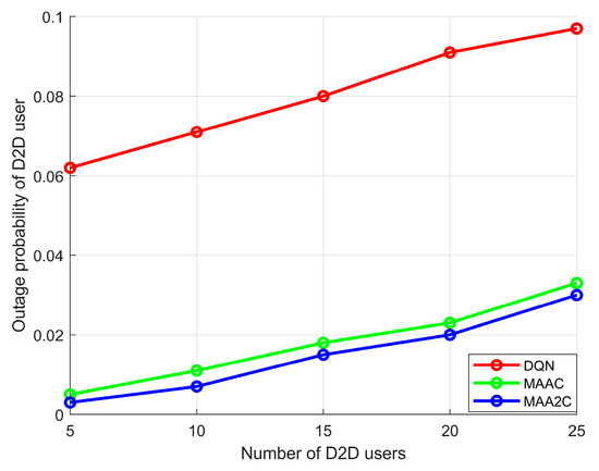 In order to prove that the D2D link has good communication performance when the algorithm proposed in this paper is multiplexed in cellular networks, the trend curve of D2D outage probability is shown. Figure 7 shows the relationship curve between the outage probability of D2D users and the number of D2D users. It can be seen from Figure 7 that the algorithm proposed in this paper is better than the DQN resource allocation scheme, and slightly better than MAAC. It can be seen from the figure that the outage probability of DQN is the highest. The performance of MAAC algorithm is better than that of DQN, because the MAAC algorithm introduces global information to guide training, which enables agents to learn cooperative strategies and avoid interference caused by multiple D2D users’ competitive access during distributed execution. The performance of the MAA2C algorithm is better than that of MAAC, because MAA2C fully considers the parameter updating process of the state value network and action value network in the AC network and the influence of the difference between them, i.e., the dominance function, on the system on the basis of considering the cooperation of multiple D2Ds.