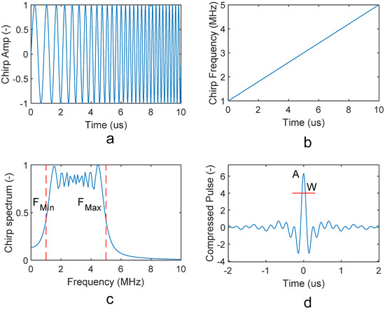 The example reported in Figure 1, generated in MATLAB (The Mathworks, Natick, MA, USA), clarifies the concept. Panel a reports a chirp with = 1 MHz and = 5 MHz, temporal duration T = 10 µs, and thus B = 4 MHz and BT product of 40. The frequency is linearly modulated by (1), like reported in Figure 1b. The spectrum of the chirp is shown in Figure 1c. Finally, after the application of the compressor filter (2), the signal assumes the peaked shape represented in Figure 1d. The width of the pulse (evaluated at −4 dB) is roughly W ≈ 1/B = 0.25 µs, and the amplitude gain is A ≈ 6.3.